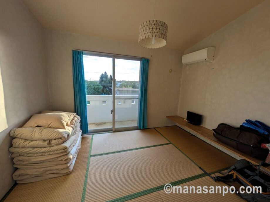 部屋はシンプルな6畳間で小さいユニットバスつき。1泊12,000円、朝食おにぎり・1室2名利用の値段です。(ひとり料金6600円×2人)