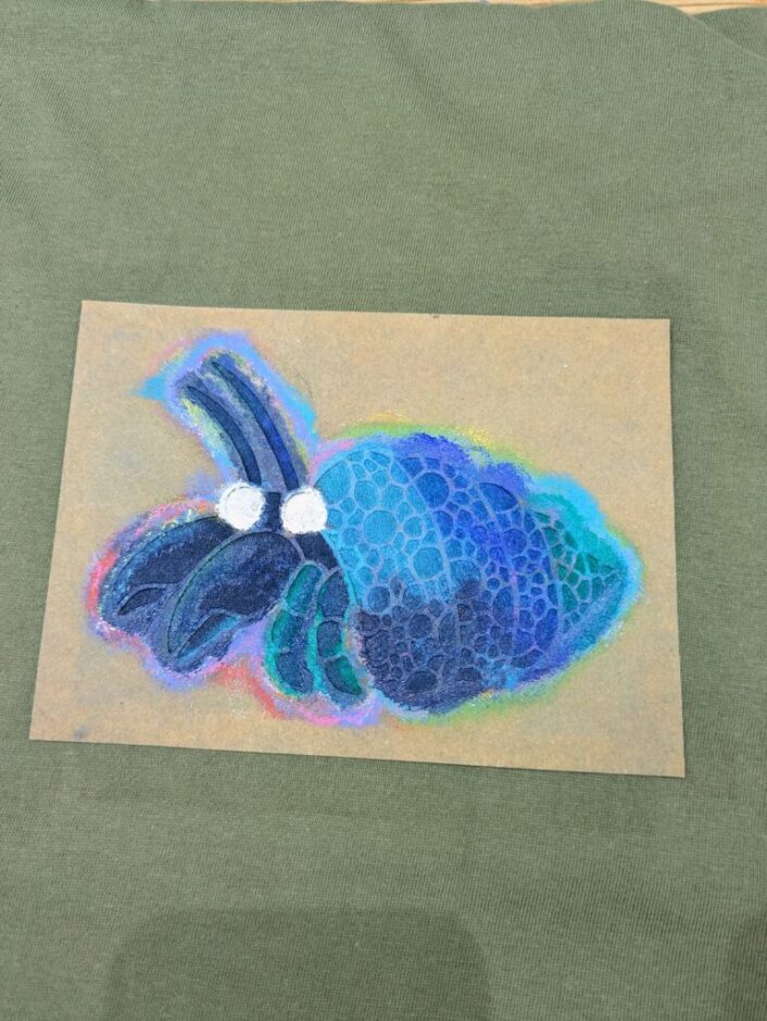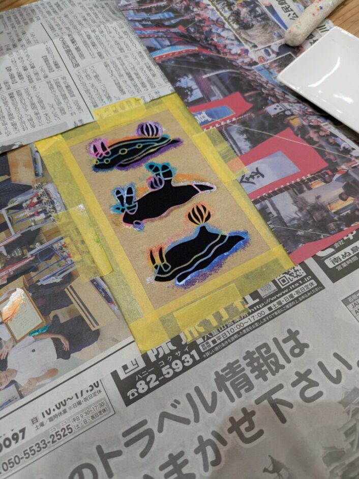ウミウシの細かい色付けに苦戦した夫。旅の最後日に再チャレンジして、カニを追加しました。