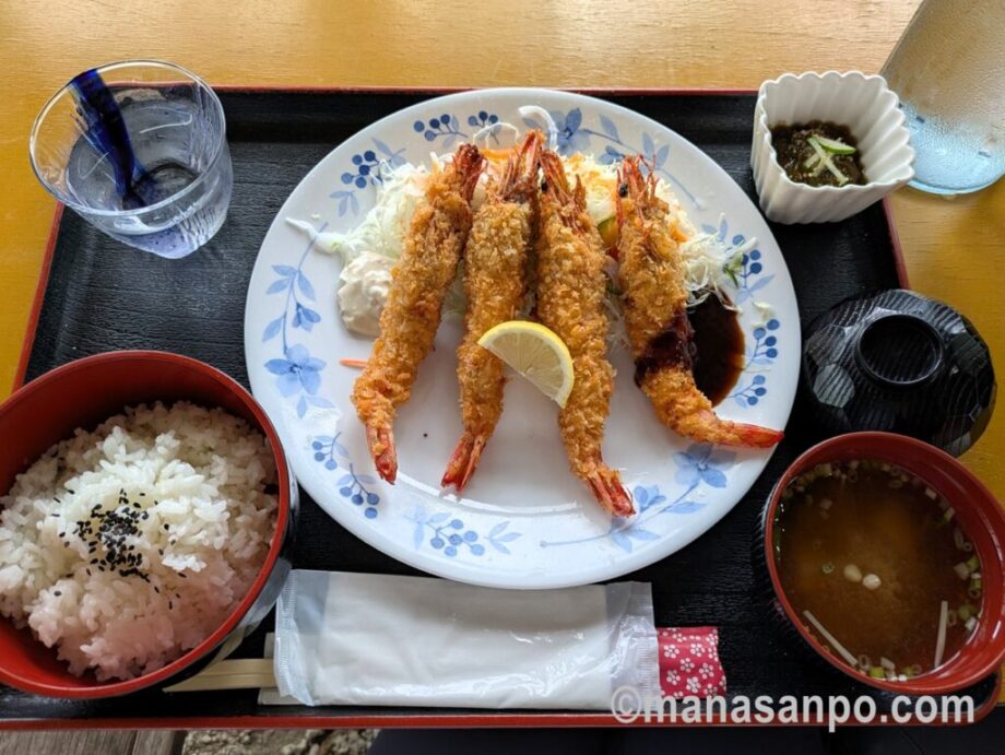 ランチはエビフライ定食。「頭も尻尾も食えるぞ」と言われたエビフライ、丸々食べました。