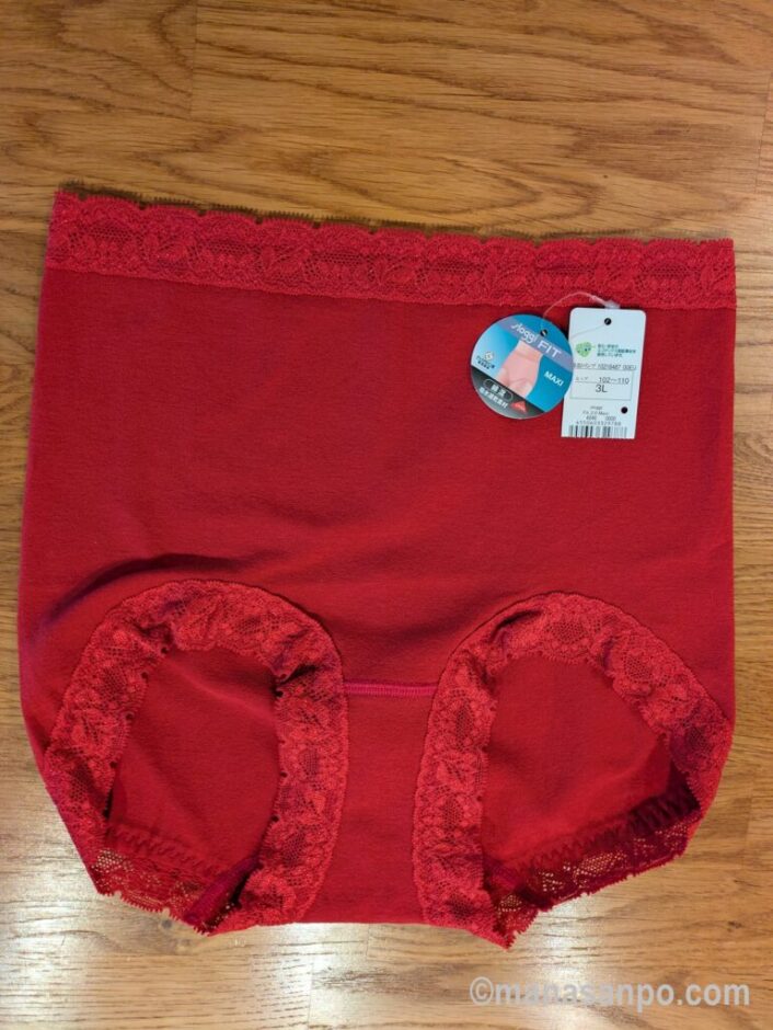 サイズ幅は、LLも3 Lを平置きにして広げても差はほぼなし。ただ、足のつけ根の部分がゆったりするほうがいいかもしれないですねとアドバイスがあり、マキシは3Lにしました。